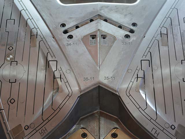 BMW end cap 1000T大型雙色模具,前模頂出需要開模同時沿分型面頂出,合模需要分型面推前模頂出系統(tǒng)回位,經過我們工程團隊前期跟客人提出的有效建議對產品的優(yōu)化,結果模具試模一次成功。